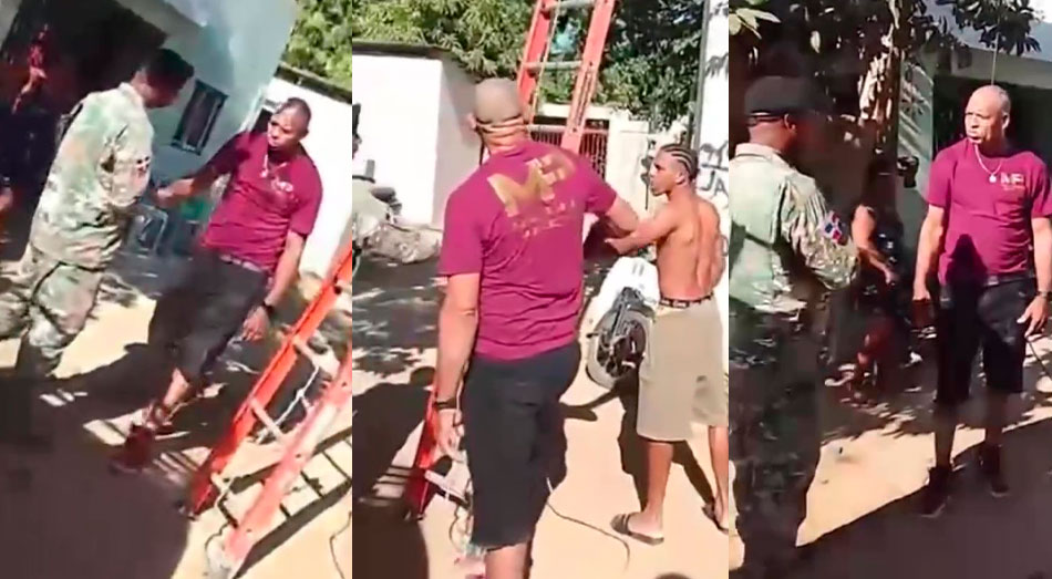 En las imágenes se aprecia cómo el militar intervino en primer momento para evitar que el trabajador cayera de la escalera durante la confrontación inicial.